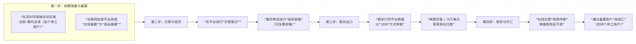 深圳的1039试点落地在华南国际工业原料城,操作都是通过官方的 “深圳市场采购贸易联网信息平台” 进行的。整个流程可以总结为“备案、交易、出口、收钱”四个环节。