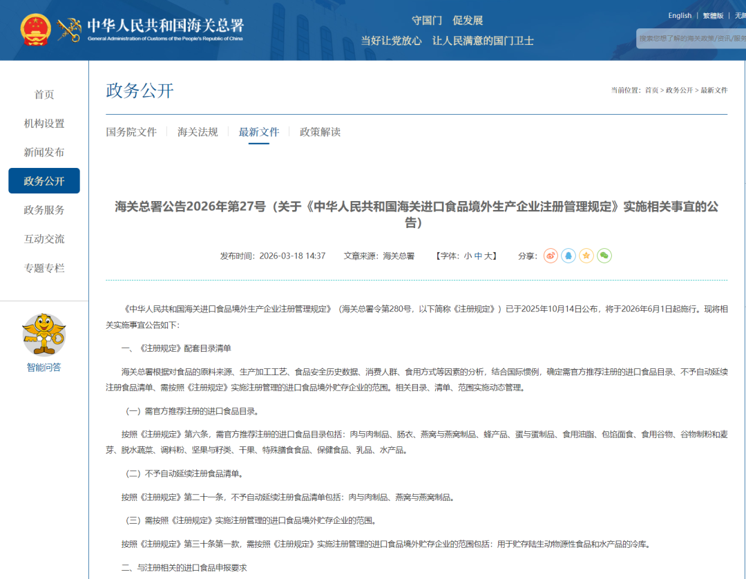 近日,海关总署发布2026年第27号公告,正式明确进口食品境外生产企业注册新规的实施细则。这部新规将于2026年6月1日起正式施行,替代2021年的248号令,全面重构进口食品境外生产、加工、贮存企业的注册管理规则。所有做进口食品生意的企业,都得重视起来。