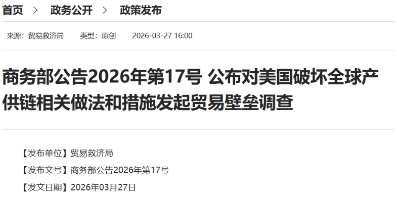 第一项调查:美国破坏全球产供链相关做法和措施(商务部公告2026年第17号)