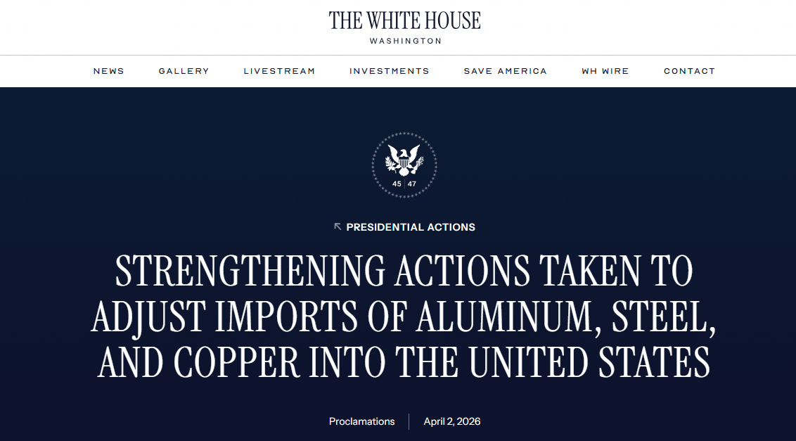 当地时间2026年4月2日,美国总统特朗普签署多项总统公告,对钢铁、铝、铜进口关税体系进行结构性调整,同时依据《1962年贸易扩展法》第232条款,对进口专利药品和制药成分加征100%关税。两项措施均自4月6日起正式生效。本文从关税调整的核心内容和出口企业的应对建议两个维度进行解读。
