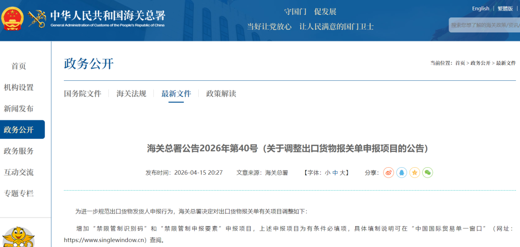 4月15日,海关总署发布2026年第40号公告,对出口货物报关单申报项目进行了重要调整:增加“禁限管制识别码”和“禁限管制申报要素”两个申报项目。这是出口管制监管的一次重要升级,出口企业和报关行都必须重视起来。